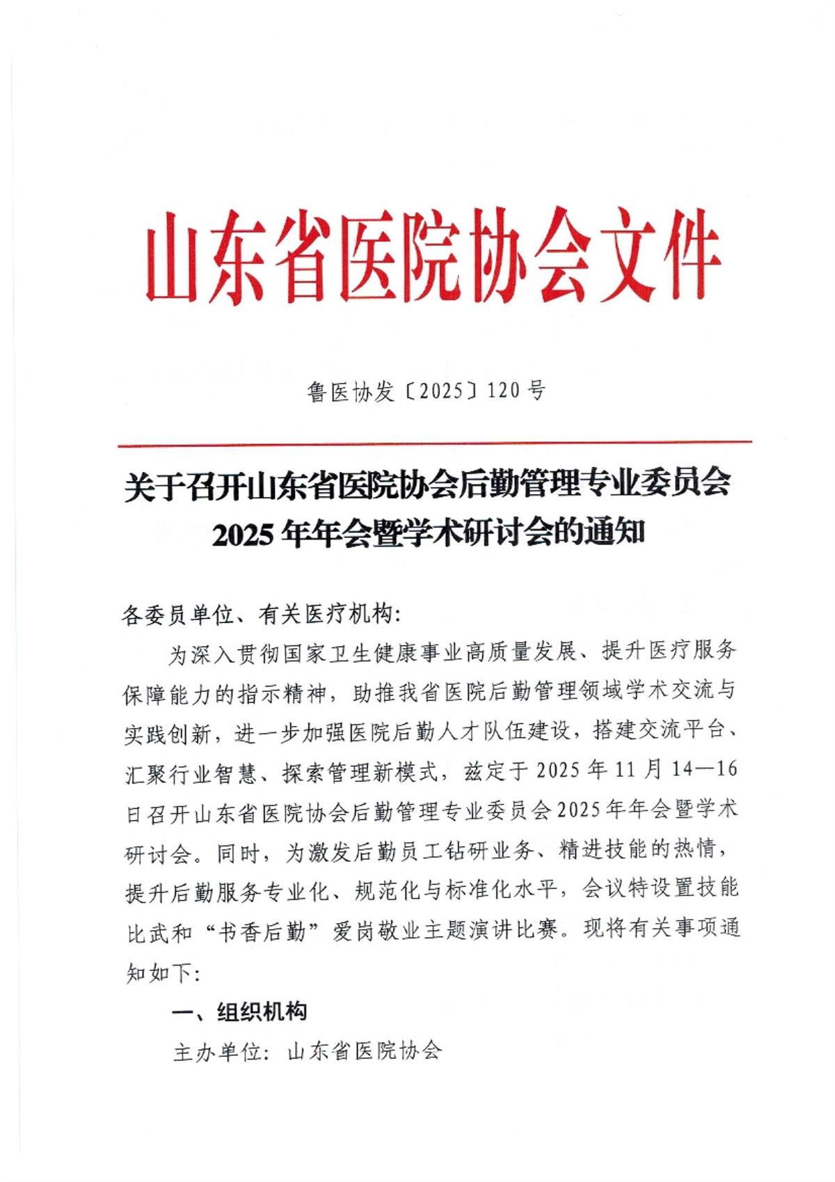 关于召开山东省医院协会后勤管理专业委员会2025年年会暨学术研讨会的通知